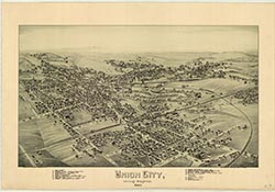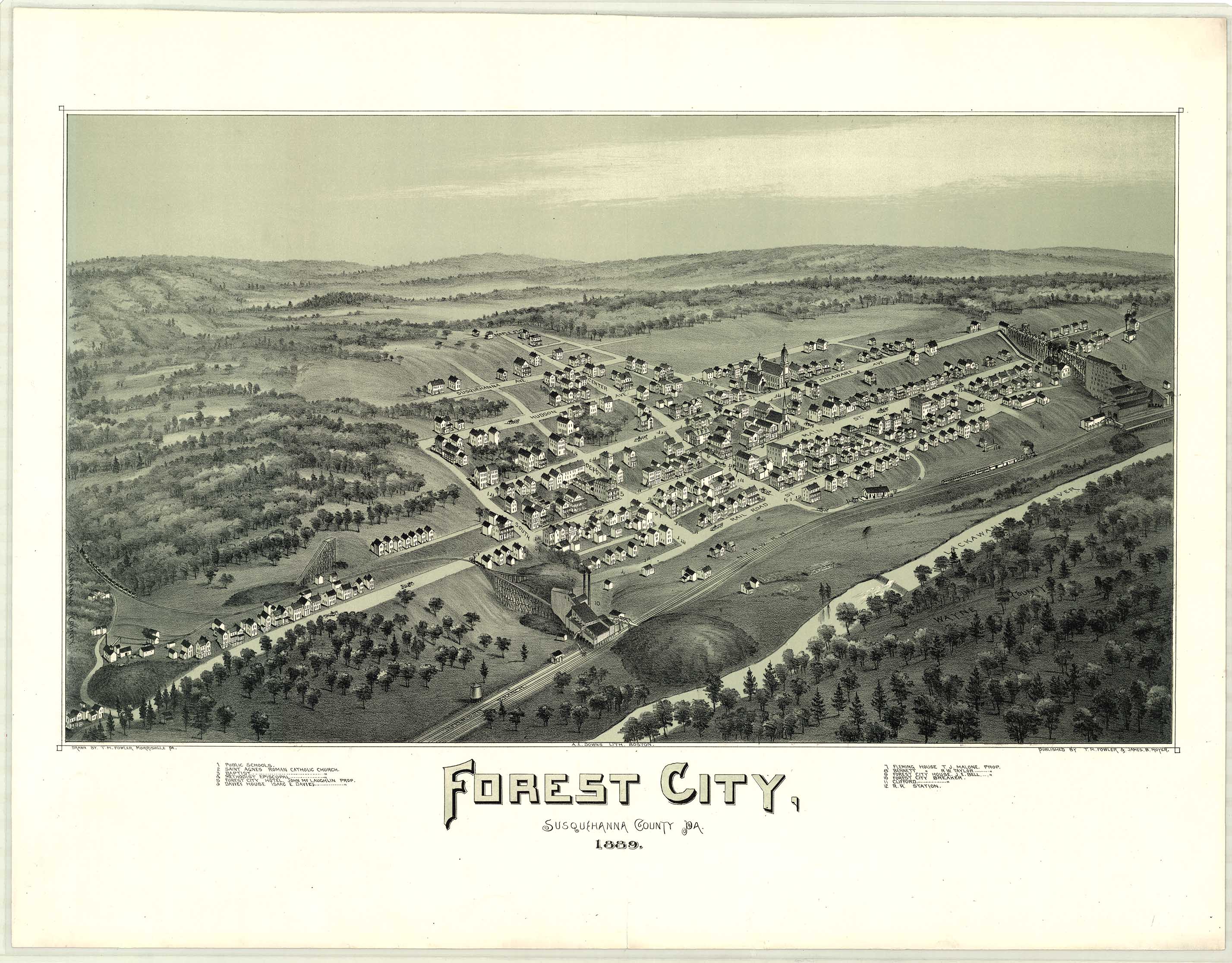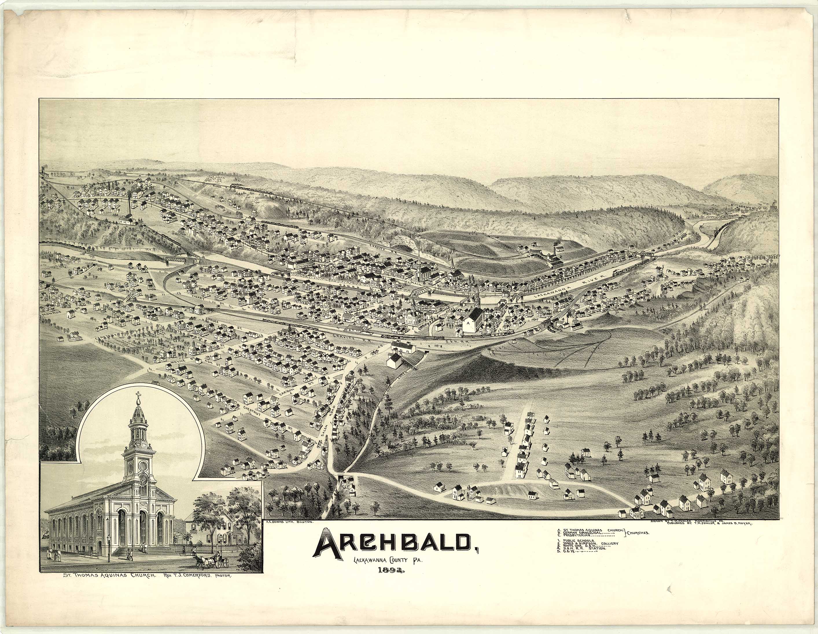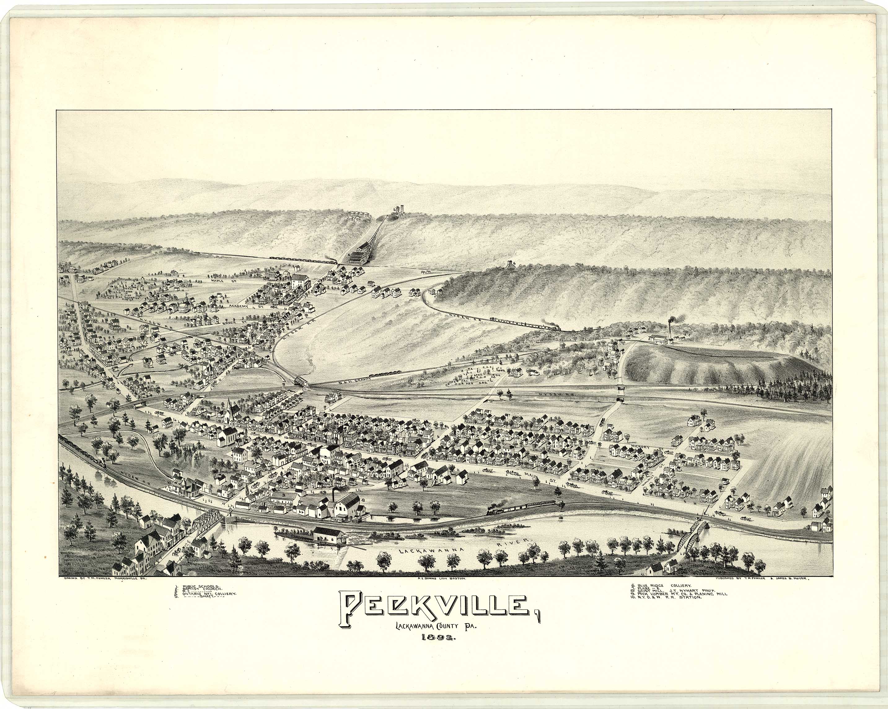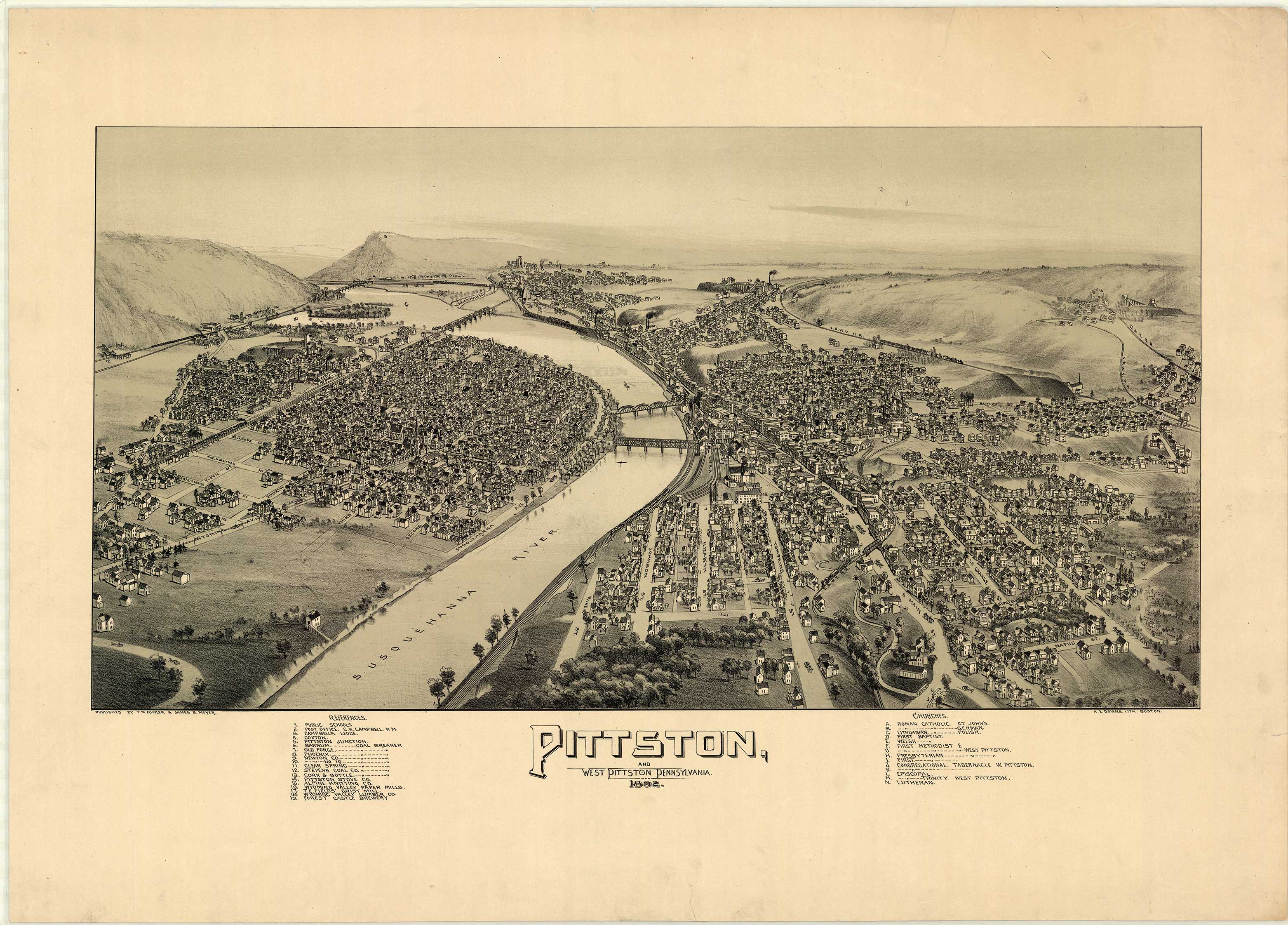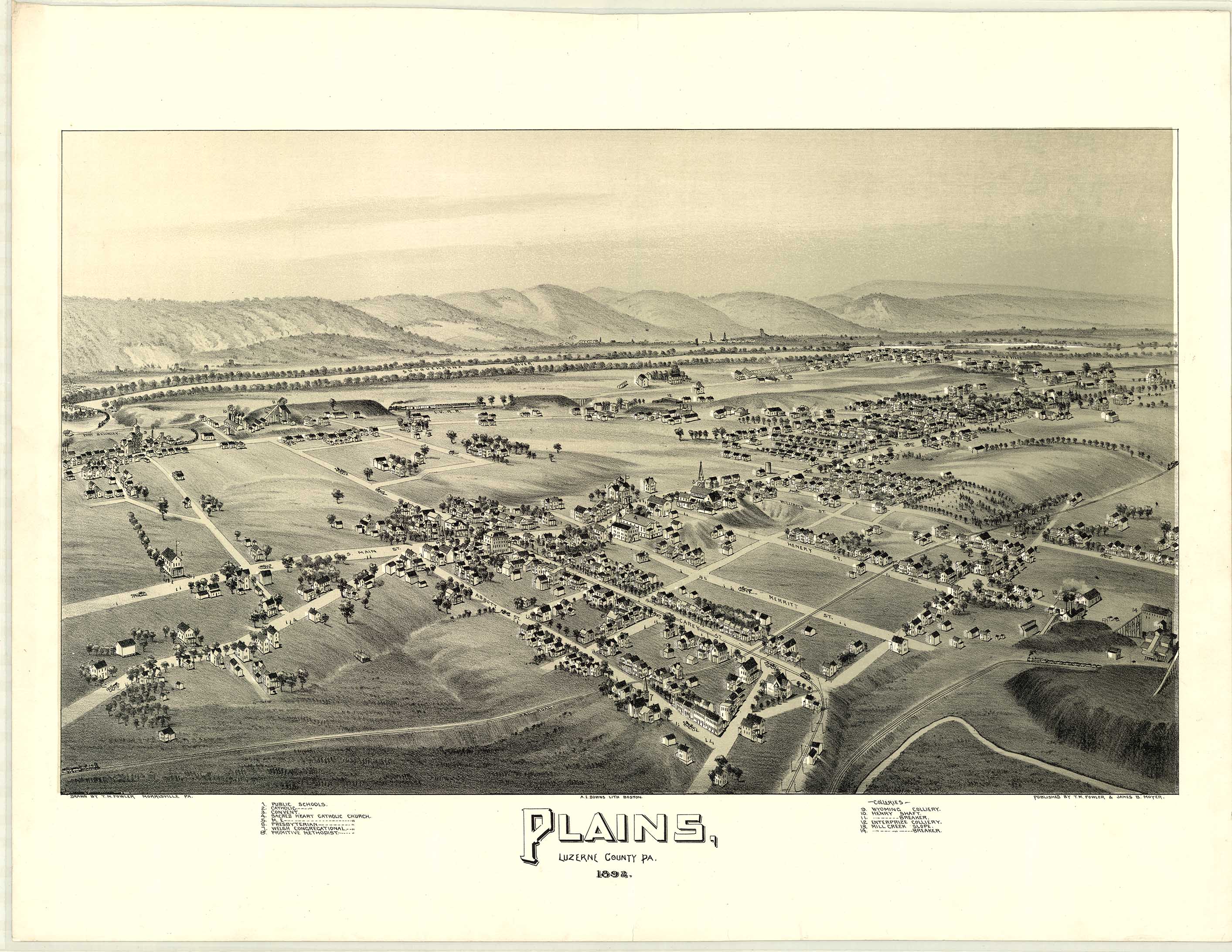 A. E. Downs, Lithograph, Boston. Shows: coal breakers, schools, railroad.