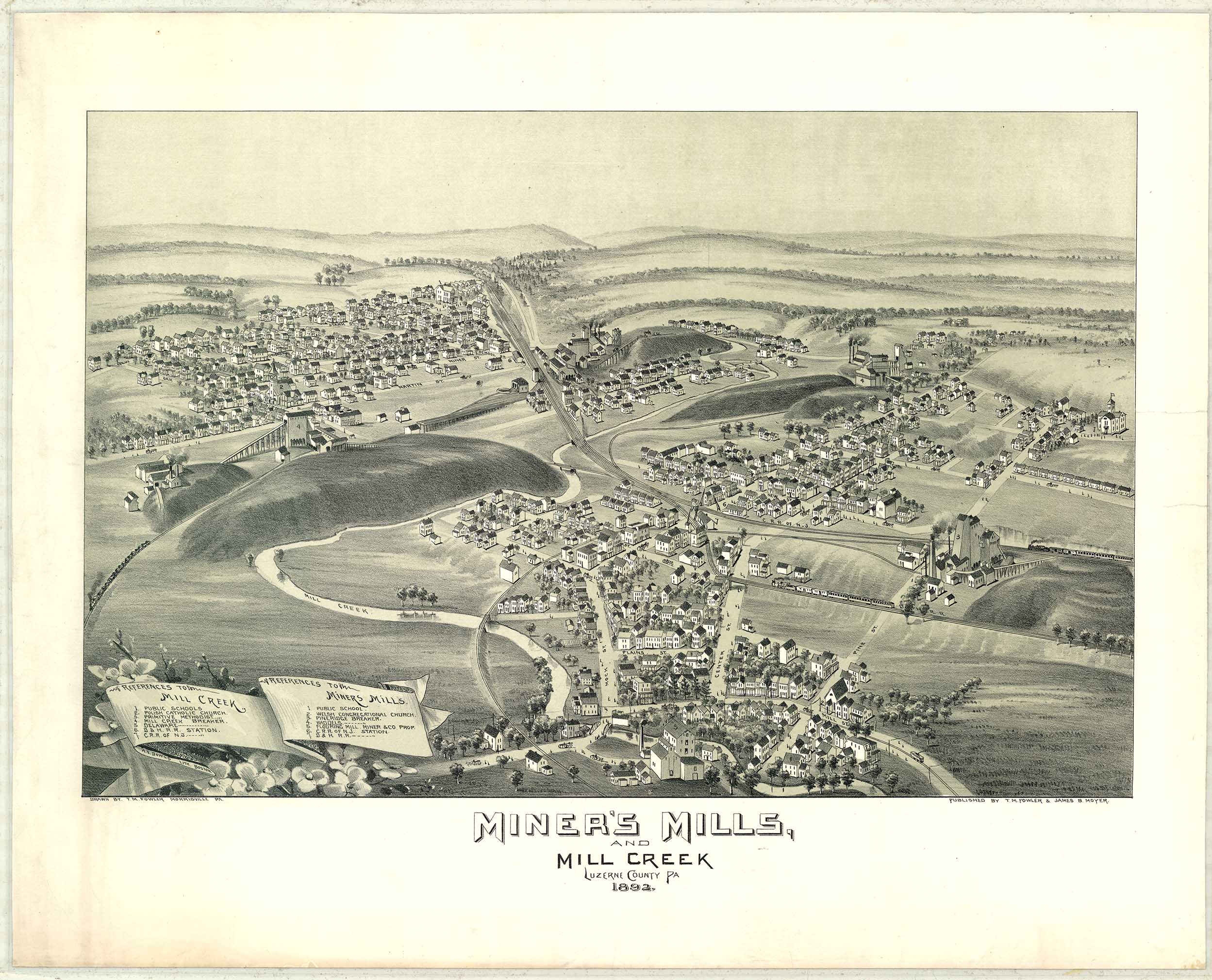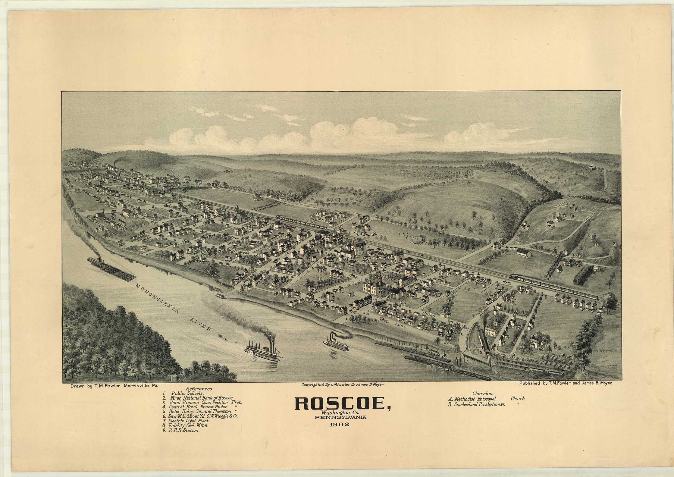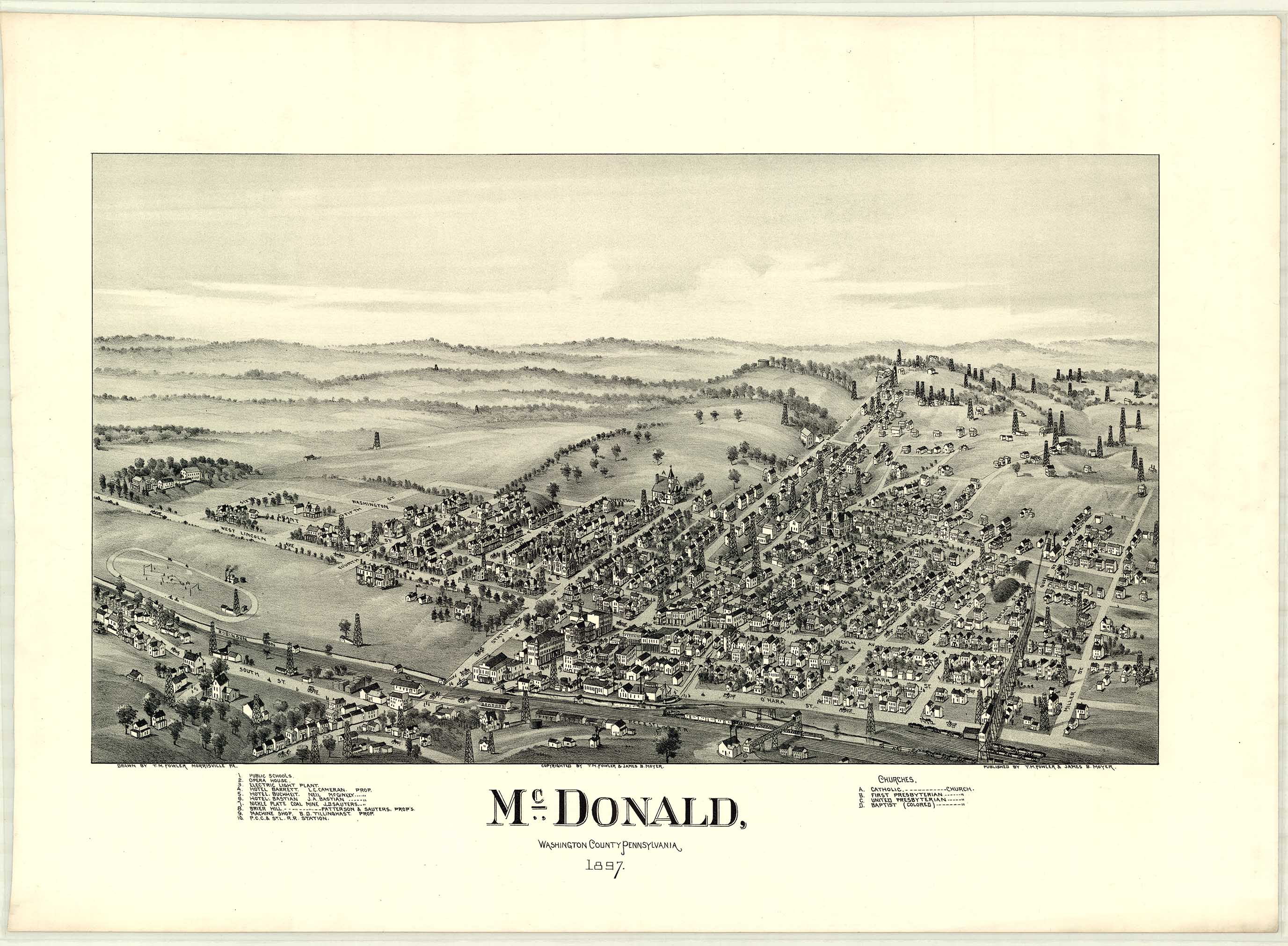 by T. M. Fowler & James B. Moyer. Shows: schools, railroad, mineral