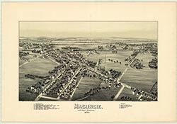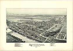 lumber yards, railroad, churches. 20 x 32. Lithograph. |