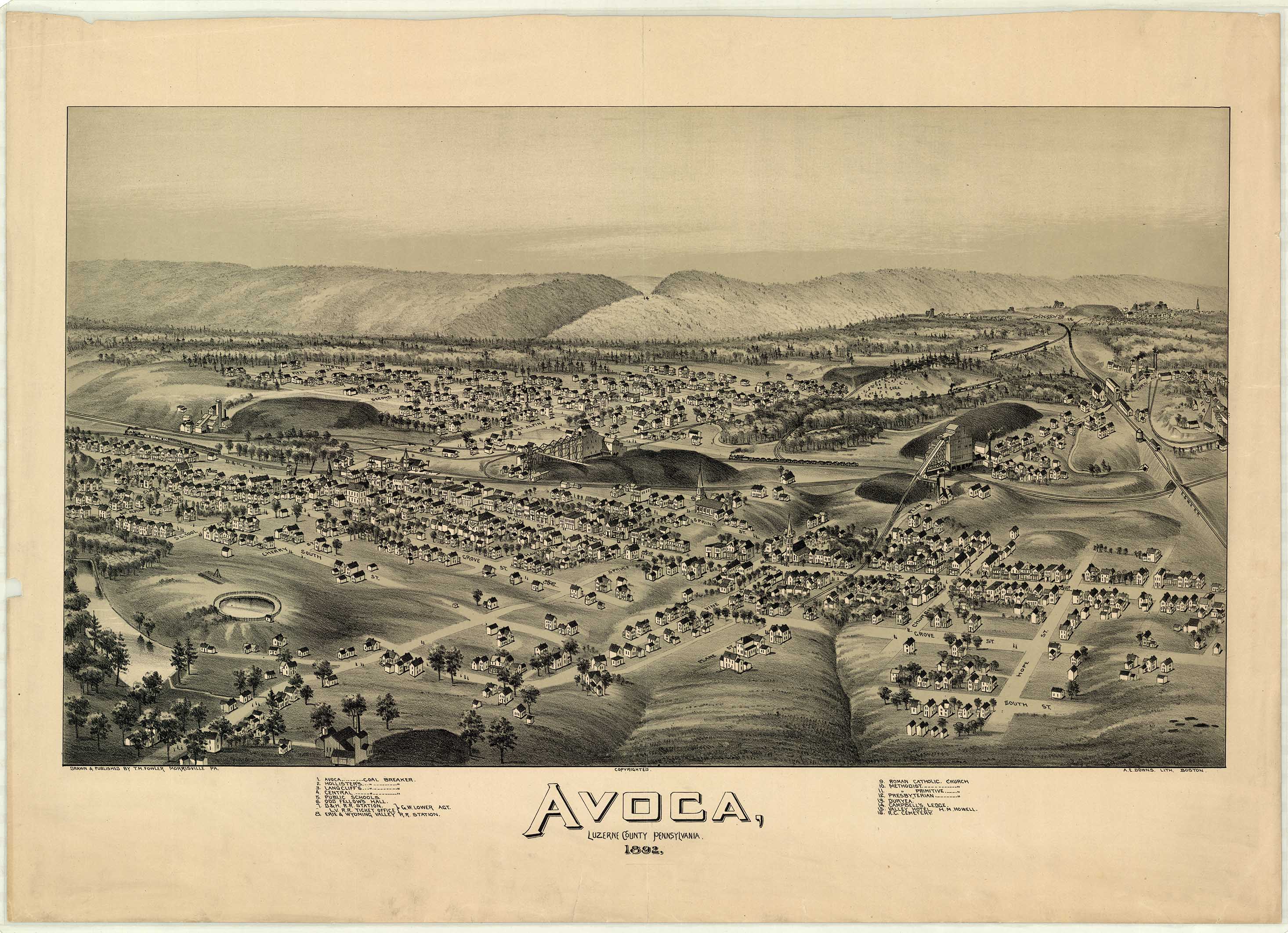 A. E. Downs, Lithograph, Boston. Shows: coal breakers, schools, railroad.