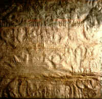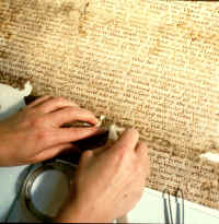 is Quite often this curling is the skin’s "memory," as it tries to revert to the animal’s original shape. The iron gall ink, lying on the surface of the parchment (as opposed to ink on paper, which is absorbed by the cellulose fibers) began to dry and flake away. Page one of the Charter is the most visually pleasing, but its placement on the outside of the folded package caused it to suffer the most damage. Constant folding and unfolding prompted decay and caused it to break along the creases. The most prominent break, a large hole, occurred in the lower left-hand corner. |