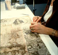 the Charter was placed in a small fire and theft-proof metal vault, It also received its first known conservation treatment. The document was sent to the Historical Society of Pennsylvania in Philadelphia where it was extracted from its frame and examined with thoughts of "restoration." It was also discovered at this time that before the Charter was framed in 1837, --all four leaves had been treated with some substance,-- presumably a consolidating coating to stabilize the flaking inks. In 1965, when the complex housing the present State Museum and Pennsylvania State Archives was dedicated as the William Penn Memorial Museum and Archives Building, the Charter was again placed on long-term display in an alcove, behind a towering statue of William Penn that dominates Memorial Hall. Not long after, it was examined, for a second time, by conservators. It was sent to a firm in Illinois for treatment that included "sterilizing the document via chemical vapor to inhibit future mold growth," possibly using thymol or ethylene oxide. These gases, which continue to emit toxins after treatment on porous materials such as parchment and paper, are known human carcinogens, and would not be recommended for use today. The firm also cleaned the surface of the pages, removed tapes attached during the earlier repair and, using new parchment, mended the holes. |