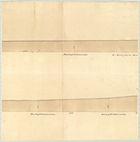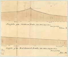 Book 14, page 01 "Profile of the Northern Route, 353 miles, 11 perches. Surveyed by William Wilson, Esqr. Profile of the West Branch Route, 365 miles, 289 perches. Surveyed by John Mitchell Esqr., n.d. Memorandum. In Seeking authority-Jany: 1881 for a United States survey, a discrepancy of 16.5 miles in distance between mouth of Sinnemahoning and Cherry Tree was discovered. This profile records 120 miles. James Worrall, E.E., Harrisburg." (8 sections) |