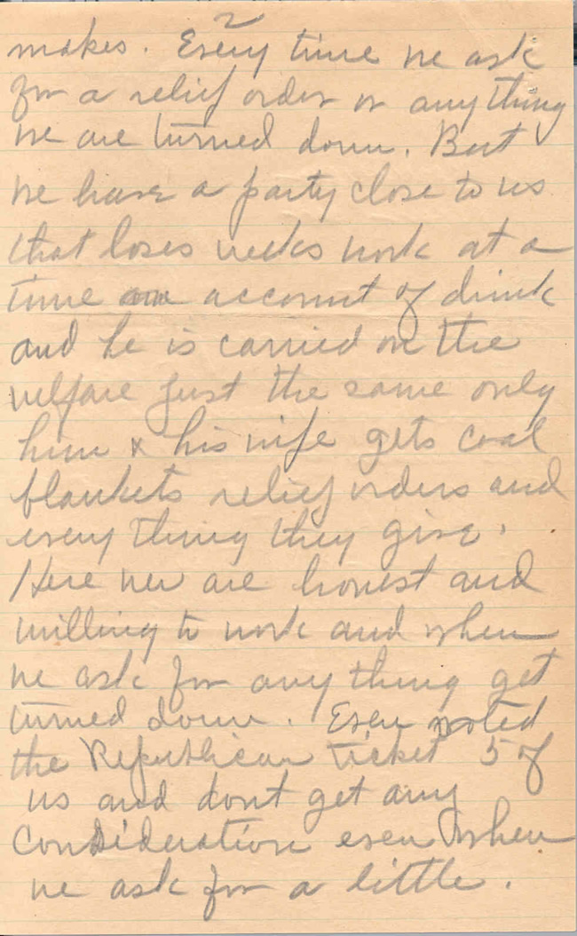 Would you please try and get us some coal as we need it very bad. I put an order in at the Union Hose House but no one seems to come around to see about it or not. If we could get work I would not ask for any thing. But _____ has been working at the park and only makes $12 some times not that much a week and now he has no work at all. They wont even given my boy _______ a job because his dad is working and he has it to keep on the little he makes. Every time we ask for a relief order or any thing we are turned down. But we have a party close to us that loses weeks work at a time account of drink and he is carried on the welfare just the same only him and his wife gets coal blankets relief orders and every thing they give. Here we are honest and willing to work and when we ask for any thing get turned down. Even voted the Republican ticket 5 of us and dont get any consideration even when we ask for a little coal that we cant possibly buy and need it for the little children and also food and shoes but we cant get any thing it seems. Kindly look after this for me please.
